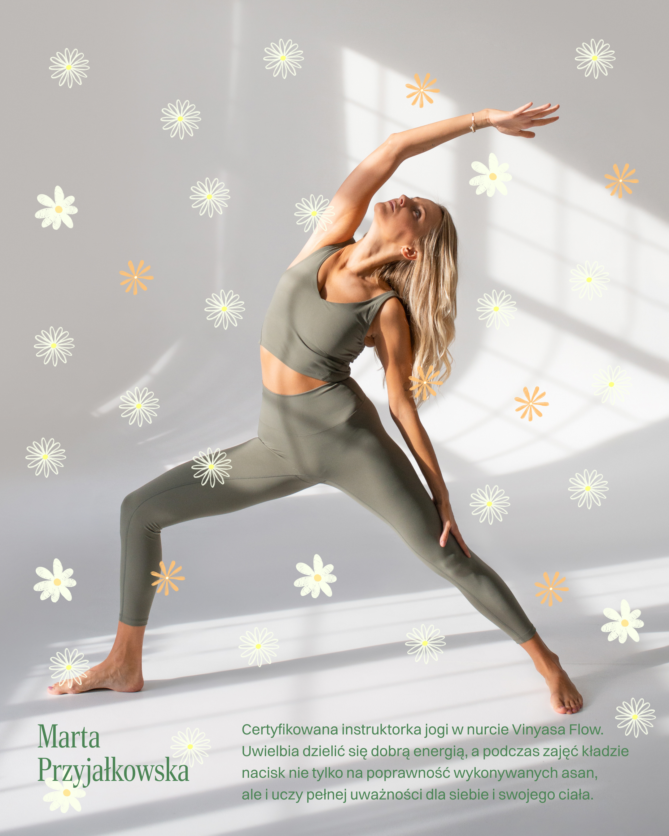 Praktykę jogi oraz warsztaty poprowadzi Marta Przyjałkowska - certyfikowana instruktorka jogi w nurcie Vinyasa Flow. Dla niej połączenie ruchu z świadomym oddechem stanowi źródło siły i inspiracji do działania. Uwielbia dzieli się dobrą energią, a podczas zajęć kładzie nacisk nie tylko na poprawności wykonywanych asan, ale i uczy pełnej uważności dla siebie i swojego ciała.
